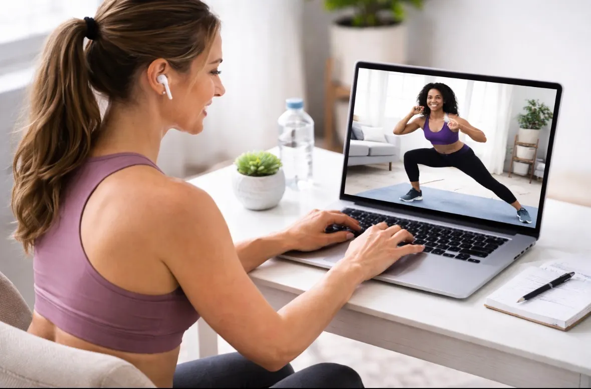 A phone/tablet/laptop + internetA small space to moveEquipment dumbbells, bands, kettlebells.